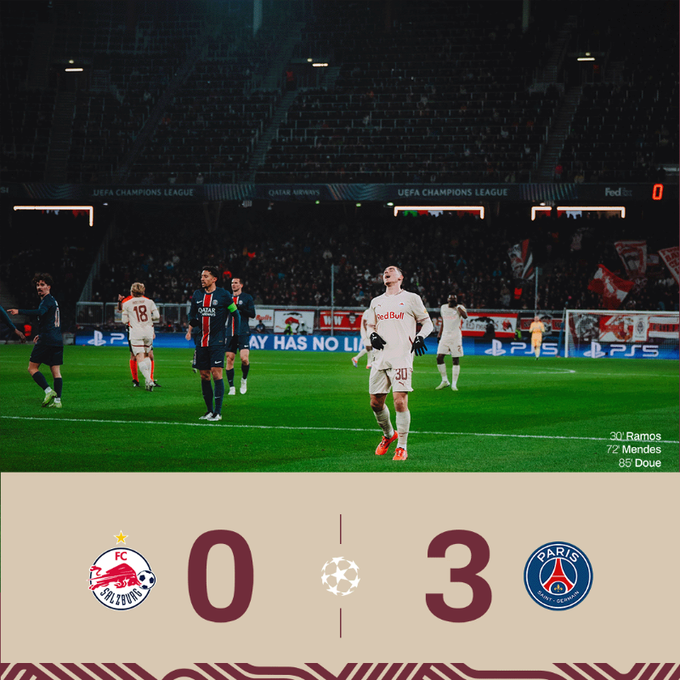 Le troisième match du 6ème tour de la phase de championnat de la Ligue des Champions de la saison 2024/2025. Le Red Bull Salzbourg a accueilli le Paris Saint-Germain FC à la Red Bull Arena de Salzbourg. Les hôtes se battaient pour reconquérir le championnat autrichien qu'ils avaient perdu il y a un an. Avant le 17e tour de la Bundesliga autrichienne, ils occupaient la cinquième place du classement, à TREIZE POINTS derrière le leader du SK Sturm Graz. Lors du tour de championnat de l’UEFA Champions League 2024/2025, l’équipe locale a mal joué. Avant ce tour, ils occupaient la trente-deuxième place du classement, DOUZE POINTS derrière le Liverpool FC, premier. Lors du mercato d'été, les Tricolores ont acquis Federico Crescenti (retour du SW Bregenz en prêt), Kilian Ludewig (retour du TSV 1860 Munich en prêt), Luis Fernando Vásquez Díaz (Lucho Vásquez - retour du SV Kapfenberg en prêt), John Olof Mellberg (John Mellberg - retour du FC Liefering après prêt), Gaoussou Diakité (de retour de prêt du FC Liefering), Lukas Ibertsberger (de retour de prêt de Wolfsberger AC), Soumbeïla Diakité (de retour de prêt de FC Liefering), Lawrence Agyekum (de retour de prêt de FC Liefering), Samson Okikiola Tijani (Samson Tijani - de retour du Wolfsberger AC en prêt), Nicoló Turco (de retour du FC Liefering en prêt), Mamadou Sangaré (de retour du TSV Hartberg en prêt), Nico Mantl (de retour du Viborg FF en prêt), Adam Daghim (de retour du FC Liefering en prêt), Dijon Kameri (de retour du Grasshoppers Club Zürich en prêt), Kamil Piątkowski (retourné du Grenade CF en prêt), Ignace van der Brempt (retour du HSV Hambourg après prêt), Salko Hamzic (transfert définitif du FC Liefering), Oliver Lukić (transfert définitif du FC Liefering), Janis Jonathan Blaswich (Janis Blaswich - prêt du RB Leipzig), Takumu Kawamura (transfert définitif du Sanfrecce Hiroshima), Bobby Lamont Clark (Bobby Clark - transfert final du Liverpool FC), Edmund Baidoo (transfert définitif de Sogndal IL), Stefan Bajčetic Maquieira (Stefan Bajčetic - prêt du Liverpool FC) et Joane Kouakou Gadou (Joane Gadou - transfert définitif du Paris Saint-Germain FC). De plus, ils ont perdu Flavius ​​​​​​David Daniliuca (Flavius ​​​​​​Daniliuc - retour à l'US Salernitana 1919 après un prêt), Andreas Ulmer (non-prolongation du contrat expirant), Kilian Ludewig (non-prolongation du contrat expirant), Nicoló Turco (prêt de l'AC Milan), Lukas Ibertsberger (transfert définitif au FC Blau-Weiß Linz), Sékou Koïta (transfert définitif au CSKA Moscou), Nico Mantl (transfert définitif au FC Arouca), Mamadou Sangaré (transfert définitif au SK Rapid Wien), Jakob Brandtner (transfert définitif au FC Liefering), Alparslan Baran (non-prolongation de contrat expirant), Julian Aumayr (transfert définitif à l'USC Eugendorf), Justin Omoregie (prêt au TSV Hartberg), Federico Crescenti (prêt au FC Vaduz), Lawrence Agyekum (prêt au Cercle Brugge), Lucho Vásquez (transfert définitif au KF Skënderbeu Korcza), Strahinja Pavlovic (transfert définitif à l'AC Milan), Timo Phil Horn (Timo Horna - finale transfert au VfL Bochum), Luka Sučić (transfert définitif au Real Sociedad de Fútbol), Amankwah Forson (transfert définitif au Norwich City FC), Lukas Wallner (transfert définitif au Hannover 96), Jonas Krumrey (prêt au Lyngby BK), Dijon Kameri (prêt au SCR Altach), Roko Šimić (transfert définitif au Cardiff City FC), Ignace Van der Brempt (prêté à Como 1907), Samson Tijani (prêté au Fredrikstad FK), Soumbeïla Diabaté (prêté au FC Blau-Weiß Linz) et Oumar Mickaël Solet (Oumar Solet - transfert définitif à l'Udinese Calcio). Lors des cinq derniers matches de Ligue des Champions, Die Bullen N'A EU QU'UNE SEULE VICTOIRE (à l'extérieur contre le Feyenoord Rotterdam NV 1:3) et A SUBI QUATRE DÉFAITES (à l'extérieur contre l'AC Sparta Prague 3:0 et le Bayer 04 Leverkusen 5:0 et à domicile contre Stade Brestois 29 0:4 et GNK Dinamo Zagreb 0:2). Dans le groupe de match de l'équipe de Pepijn Lijnders (Pep Lijnders), pour le départ contre les Rouge-et-Bleu, il n'y avait pas Hendry Aron Blank (Hendry Blank - maladie), Janis Blaswich (blessure au mollet), Fernando dos Santos Pedro (Fernando - blessure à la cuisse), Maurits Kjærgaard (blessure à la cheville), Karim Konaté (blessure au genou) et Aleksa Terzić (blessure musculaire). La performance de Kamil Piątkowski était discutable (blessure musculaire). Les invités se sont battus pour le quatrième Championnat de France consécutif. Avant la 15ème série de matches de Ligue 1 française, McDonald's 2024/2025 était en tête avec cinq points d'avance sur la deuxième place de l'Olympique de Marseille. Lors du tour de championnat de l'UEFA Champions League 2024/2025, les visiteurs ont mal performé. Avant cette série de matchs, ils occupaient la vingt-cinquième position, onze points derrière le Liverpool FC, premier. Lors des cinq derniers matches de Ligue des Champions, les Parisiens N'ONT EU QU'UNE SEULE VICTOIRE (à domicile contre le Girona FC 1-0), ont fait match nul (à domicile contre le PSV Eindhoven 1-1) et ont subi trois défaites (à l'extérieur contre l'Arsenal FC 2- 0 et FC Bayern Munich 1-0 et à domicile contre le Club Atlético de Madrid 1-2). L'équipe de Luis Enrique Martínez García (Luis Enrique) pour le match contre les Red Bulls comprenait Masour Ousmane Dembélé (Ousmane Dembélé - carton rouge du voyage à Munich), Lucas François Bernard Hernández Pi (Lucas Hernández - blessure au genou) et Senny Mayulu (blessure veaux). Quelle équipe s'est rapprochée de son objectif en huitièmes de finale de l'UEFA Champions League 2024/2025? Le FC Red Bull Salzbourg a-t-il réussi à domicile en Coupe d'Europe? Le Paris Saint-Germain FC a-t-il profité de l'avantage de son équipe en Autriche? Découvrons-le.