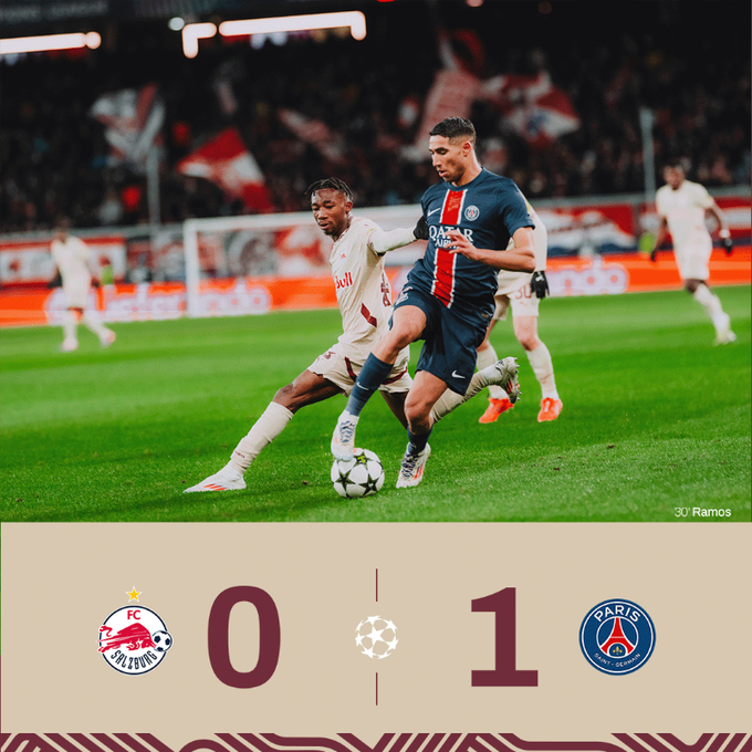 À la trente-quatrième minute, Achraf Hakimi fait une passe précise du côté droit du terrain. Gonçalo Ramos s'empare du ballon, mais son coup de tête passe loin du poteau gauche du but des locaux. Une minute plus tard, Daouda Guindo recevait un carton jaune pour avoir délibérément joué le ballon de la main dans la moitié de terrain des visiteurs. Trente-huitième minute, Fabián Ruiz adresse une passe perpendiculaire à Bradley Barcola. L'ailier gauche des visiteurs s'engouffre dans les seize mètres locaux, mais son uppercut passe juste à côté du poteau gauche du but des Red Bulls. À la quarante-cinquième minute, Kang-In Lee effectue un centre précis sur un coup de pied de coin. Marcos Aoás Corrêa (Marquinhos) se précipite sur le ballon, mais son coup de tête passe à côté du poteau gauche du but des vice-champions d'Autriche.